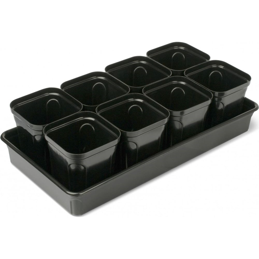 Комплект подходит для выращивания саженцев, цветов и прочих декоративных растений. На поддоне (41х21см) размещается 8 стаканчиков объемом 645 мл. Стаканчики имеют дренаж.