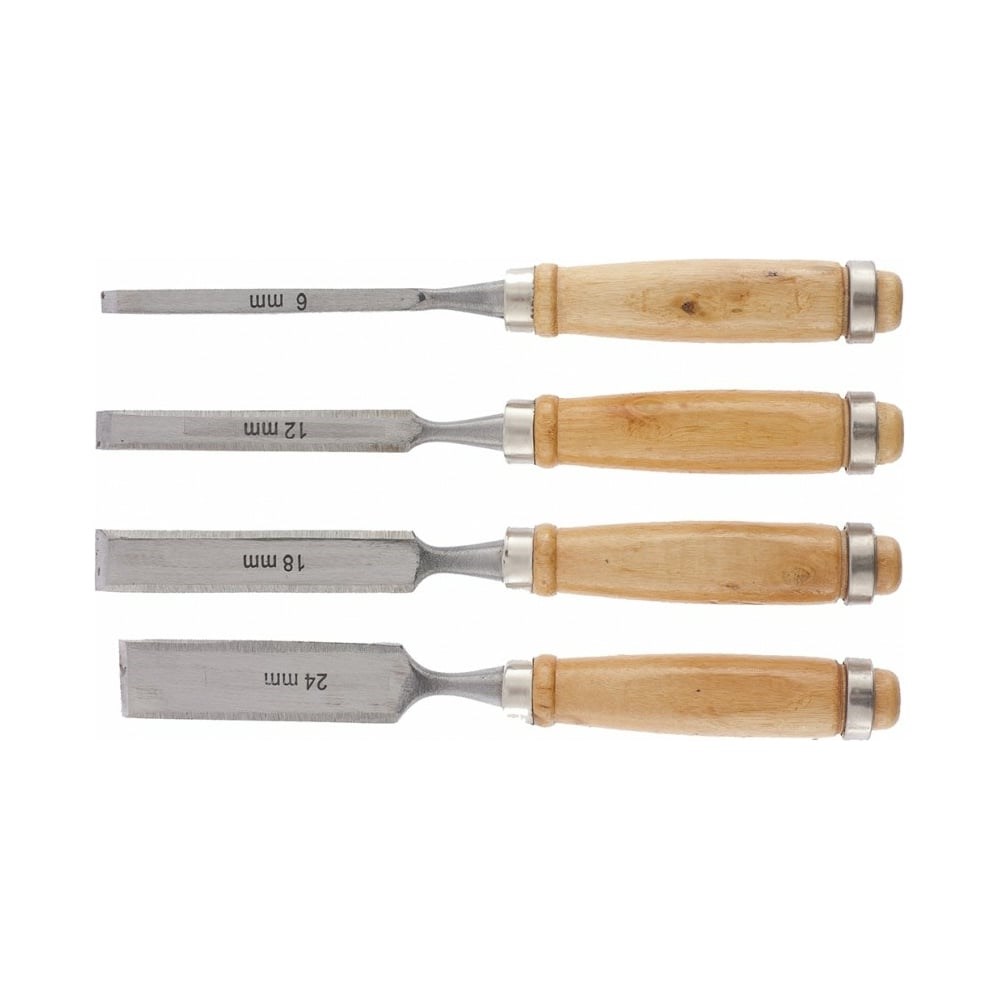 Набор плоских долот-стамесок Sparta 242405 размером 6-12-18-24 мм, с деревянными рукоятками, пригодится для выборки и зачистки пазов под врезные замки, снятия фасок, отделения стружки и других столярно-плотницких работ. Ударные стамески легче врезаются в древесину и обеспечивают ровный срез, т.к. по их торцу можно наносить удары киянкой или небольшим молотком.