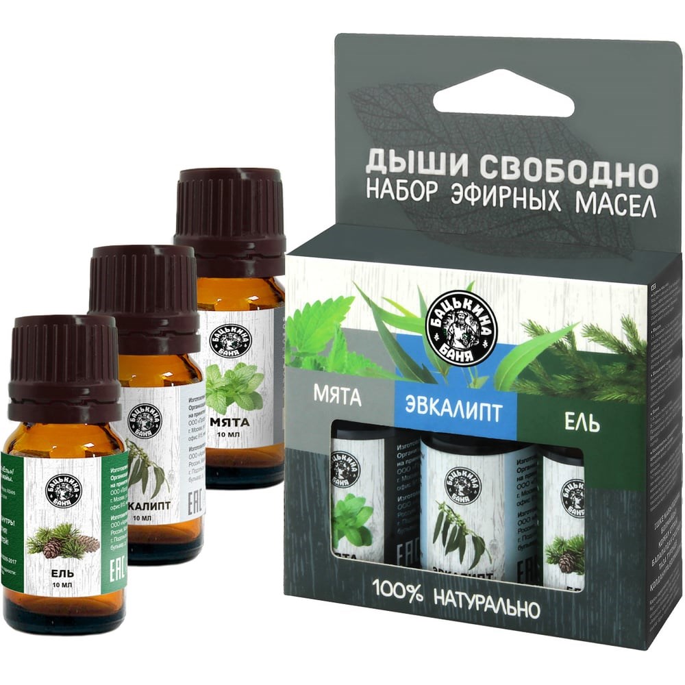 Набор эфирных масел Бацькина баня Дыши свободно 16102 для бани и сауны содержит в себе органические натуральные эфирные масла мяты, ель, эвкалипт. Ароматическое масло применяется, как косметика, для массажа, защита при солнечных ожогах, как уход за кожей лица и тела, изготовления смеси от целлюлита, от прыщей и для ароматизации дома, ванны, обогащения кремов и шампуней, аромамедальонов. Аромомасло подходит для нанесения на волосы, как косметическое масло для лица. Масла применяются в мыловарении, изготовлении свечей. Эфирное масло предназначено для использования в паровой бане и сауне. Косметический эффект масел сохраняет красоту кожи лица и тела, здоровье волос. Аромомасло избавляет от целлюлита. Уход за телом и лицом. Аромамасла подходят для аромалампы, саше, аромадиффузор. Используется, как жидкий ароматизатор для дома, для медитации и йоги, для расслабления или для поднятия настроения. Проверяйте непереносимость для эфирных масел.