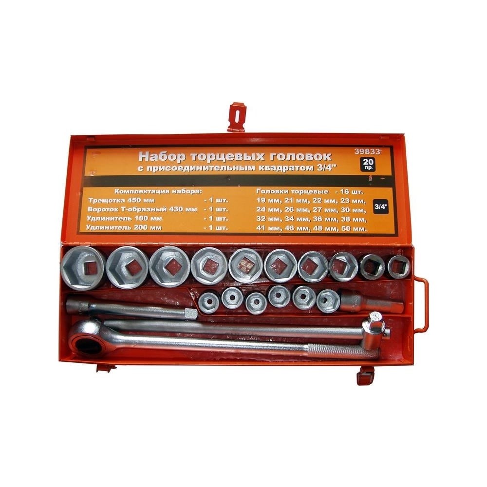 Набор головок АвтоDело 3/4", 19-50 мм, 20 предметов 39833 10247 оптимален при ремонте грузовых транспортных средств. Модель предназначена для использования в автомастерской и на станции технического обслуживания. Ключевые особенности: произведен методом горячей штамповки; поставляется в металлическом кейсе, что обеспечивает удобство при транспортировке и хранении; имеет компактный размер и небольшой вес, что создает комфортные условия в процессе эксплуатации. Набор укомплектован трещоткой с дисковым переключателем, Т-образным воротком, удлинителями и торцевыми головками с размерным рядом от 19 до 50 мм.