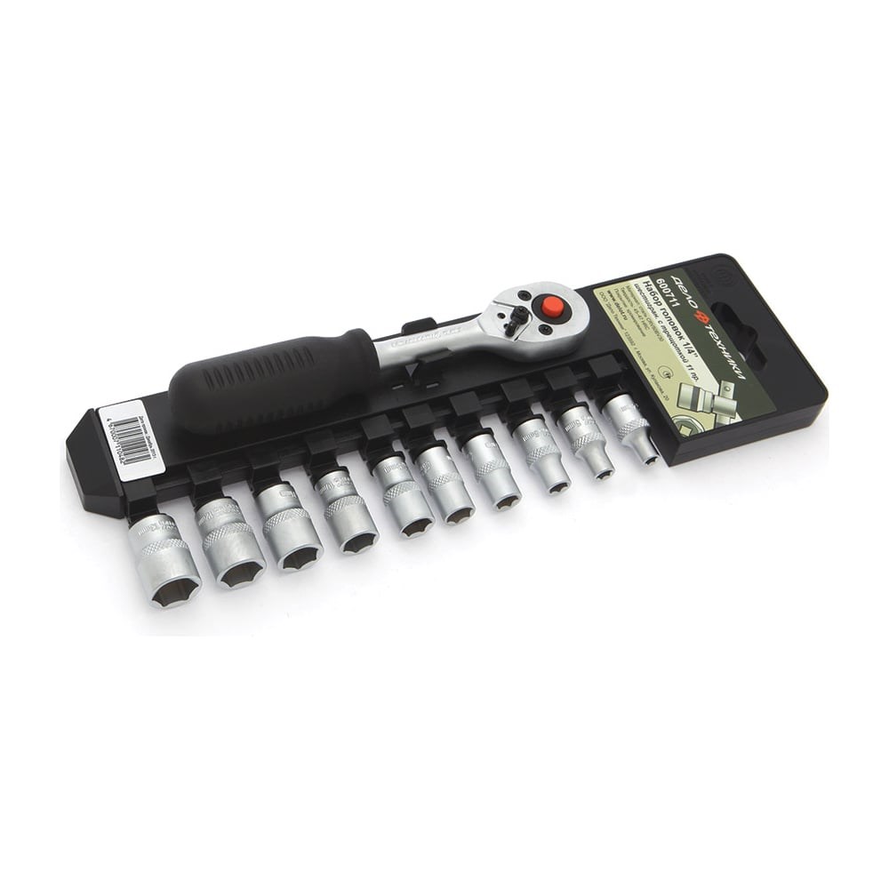 Набор шестигранных головок с трещоткой 1/4 11 предметов ДТ/48 Дело Техники 600711 выполнен из высококачественных материалов. Рабочие части изготовлены из прочной хромванадиевой стали. Удобная рукоятка трещотки имеет специальную поверхность для исключения выскальзывания инструмента. Квадрат 1/4". Пластиковый держатель необходим для хранения и переноски приспособлений.