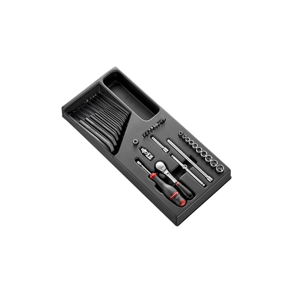 Набор головок FACOM 1/4, с аксессуарами MOD.RL1 - набор профессиональных метрических инструментов 1/4" дюйма. Содержит 10 шестигранных торцевых головок 1/4'', трещотки 1/4'', удлинителя на 1/4", скользящего воротка; отвертки-битодержателя; 11 длинных шестигранных ключей со сферической головкой и пр. Модуль идеально подходит для инструментальных тележек и ящиков.