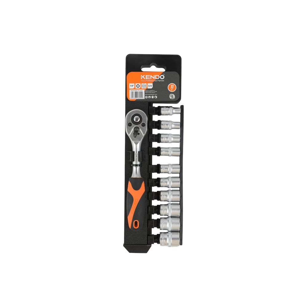 Набор головок с трещоткой KENDO 1/4" 11 шт 16209 используется для работ с крепежом при проведении различных монтажных и ремонтных работ. Инструмент выполнен из качественной хромованадиевой стали. Материал отличается высокой прочностью и долговечностью. Специальное покрытие обеспечивает защиту от коррозии и стойкость к износу. Эргономичная двухкомпонентная рукоятка обеспечивает комфортную эксплуатацию.