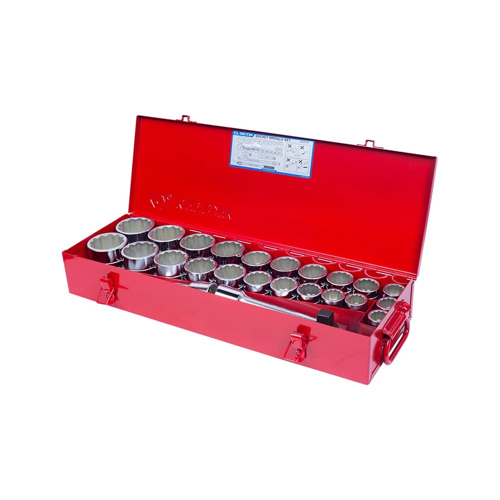 Набор торцевых головок с принадлежностями (3/4", двенадцатигранные, 22-50 мм, 1"-2", 26 предметов) KING TONY 6226CR дает возможность устанавливать оснастку под произвольным углом (в комплект входит инструмент с шарнирной конструкцией). Кейс их металла гарантирует сохранность комплектующих при перевозке. Широкий ассортимент головок позволяет без труда подбирать оснастку в соответствии с размером крепежа.