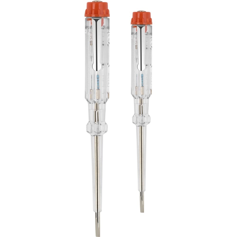 Набор индикаторов напряжения duwi IP40 140мм + 190мм 19325 8 - простой и удобный инструмент для выявления нуля и фазы или проверки наличия напряжения в сети. Она комплектуется лампочкой, которая используется в качестве светового индикатора, и резистором для ограничения тока. Ее принцип действия следующий: ток попадает в инструмент через жало, проходит через резистор, который ограничивает его величину, и доходит до контакта лампы. Ее второй контакт соединен с выводом на торце рукоятки отвертки. При использовании инструмента необходимо коснуться провода под напряжением жалом отвертки, а торца ее рукоятки – пальцем руки. В результате цепь замкнется, и лампочка засветится.