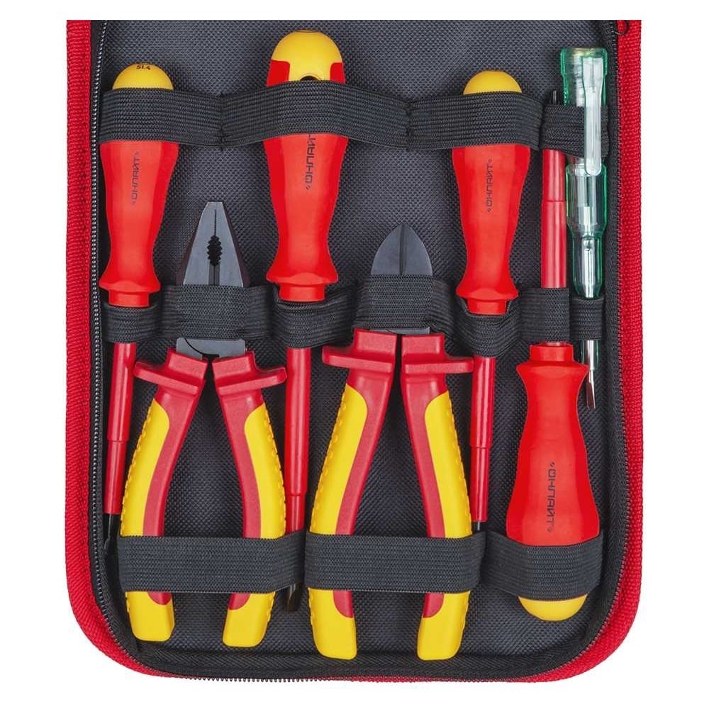 Набор диэлектрических инструментов Онлайт Монтаж OHT-Ind07-H7 предназначен для выполнения электромонтажных и слесарных работ в установках с напряжением не более 1000 В.Рабочие части губцевых инструментов (пассатижи, бокорезы, длинногубцы) изготовлены из высококачественной углеродистой стали марки 55 и тщательно отполированы. Многокомпонентные рукоятки с упорами обеспечивают крепкий хват, предотвращая проскальзывание руки. Рабочие части инструментов подвергнуты индукционному закаливанию токами высокой частоты, что значительно продлевает их ресурс. Инструменты имеют никелевое покрытие для защиты от коррозии. Сменные двусторонние стержни отверток выполнены из хром-ванадиевой стали, закалены, покрыты изоляционной оболочкой, наконечники намагничены.Компактный прочный тканевый кофр обеспечивает безопасное хранение и транспортировку инструмента.В набор входят инструменты: пассатижи 160 мм, бокорезы 160 мм, Отвертки: SL4x100, SL5.5x125, H1x100, PH2x100, Отвертка-индикатор 100–500 В, 135 мм.