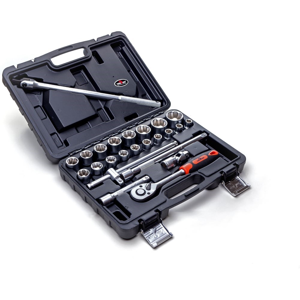 Набор инструментов СЕРВИС КЛЮЧ 25 предметов– это комплект инструмента, который поможет справиться с любой рабочей задачей. Набор включает в себя комплект головок 1/2", два разных воротка, кардан, трещотку и пару удлинителей. Подойдет как для профессионального использования в мастерской, так и автолюбителям в гараже.Металлические элементы набора изготовлены из высокопрочной хромованадиевой стали 45 твердостью не менее 40 HRC, а также имеют матовое хромированное покрытие, которое препятствует появлению коррозии. Инструменты имеют присоединительное отверстие – 1/2”.Элементы набора упакованы в чемодан, изготовленный из пластика 1-й пробы, имеет пластиковые замки, а также удобную ручку для транспортировки. Для удобства поиска все детали аккуратно рассортированы по специальным обозначенным отсекам. Чемодан защищает инструменты от пыли, влаги и повреждений.Набор состоит СЕРВИС КЛЮЧ 25 предмета состоит из:Головки (6 граней) 1/2" – размеры: 10, 11, 12, 13, 14, 15, 16, 17, 18, 19, 20, 21, 22, 23, 24, 27, 30 и 32 мм, которые подходят для работы с гайками и болтами различных диаметров. Они имеют шестигранный профиль, который обеспечивает крепкое и надежное соединение с крепежом.Вороток Т-образный СЕРВИС КЛЮЧ – это универсальный инструмент, который обеспечивает возможность приложения большего усилия за счет регулировки плеча. Имеет длину 250 мм и присоединительный квадрат 1/2".Шарнирный вороток СЕРВИС КЛЮЧ – это универсальный инструмент. В некоторых ситуациях шарнирный вороток превосходит другие воротки, за счет своего угла поворота в 180 градусов и большой длине рукоятки, что позволяет приложить более высокий крутящий момент. Имеет длину 430 мм и присоединительный квадрат 1/2".Кардан 1/2" – приспособление для воротка, которое обеспечивает гибкость и позволяет работать под разными углами, упрощая доступ к труднодоступным местам.Трещотка 1/2" – это инструмент, который ускоряет и облегчает процесс работы с крепежом, позволяет изменить направления вращения и регулировать размерУдлинители 1/2” – это два удлинителя длиной 125 мм и 250 мм, которые позволяют расширить рабочий диапазон и добраться до труднодоступных мест.