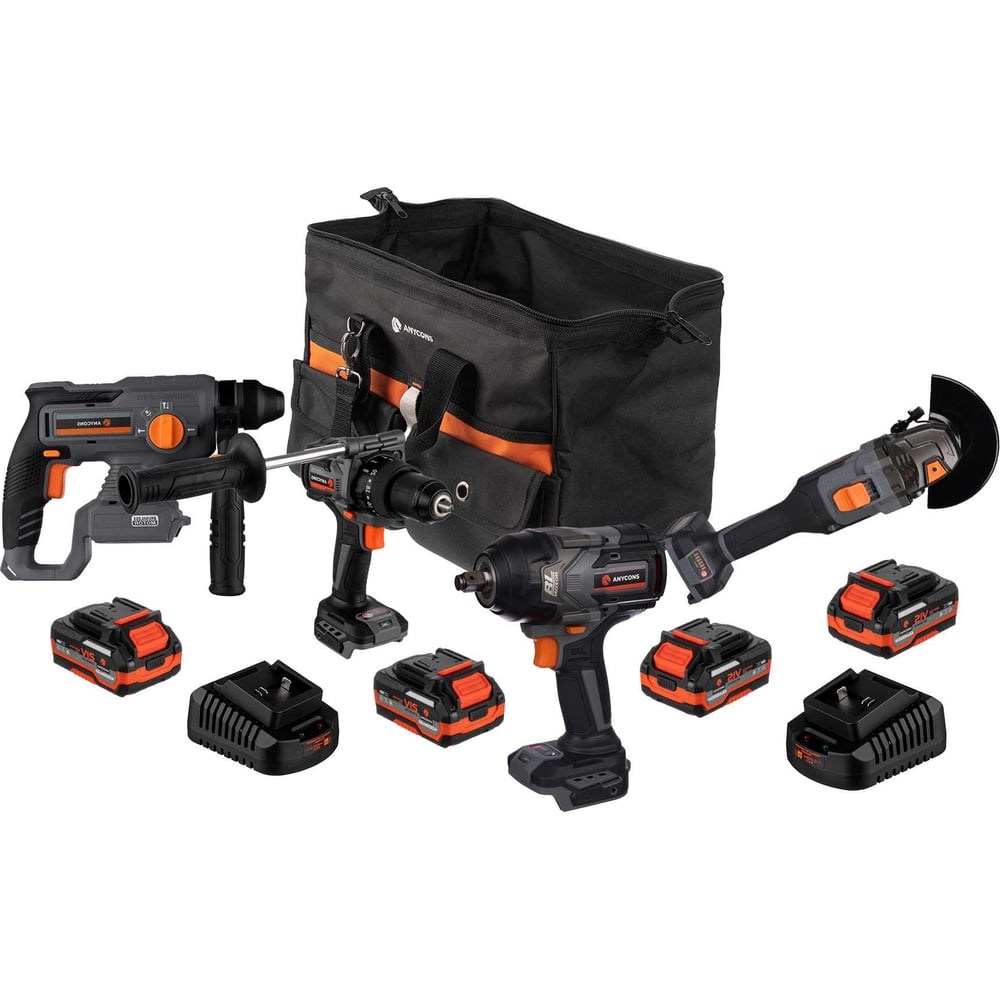 Профессиональный набор Anycons AC-ST408 сочетает в себе передовые технологии и высокую производительность благодаря бесщеточному двигателю, который гарантирует их продолжительный срок службы, наш набор включает в себя 4 инструмента, идеально подходящих для выполнения широкого спектора задач.Набор инструментов Anycons поставляется в удобной переносной сумке, которая не только облегчает транспортировку, но и обеспечивает безопасное хранение всех аксессуаров и расходных материалов.В набор входит 4 инструмента, 4 аккумулятора, зарядное устройство, сумка для хранения инструментов.Ударная дрель–шуруповертпатрон 13ммкрутящий момент 150 Н.м.макс. частота вращения 0-2200 об/минвес 1,6кГайковертпатрон ½ дюймакрутящий момент 850 Н.м.макс. частота ударов 0-2400 уд/минмакс. число оборотов 1600/2600 об/минвес 2,1кгУШМразмер диска 125мммакс. частота вращения 3500/8500 об/минрезьба шпинделя М14вес 1,65кгПерфоратортип хвостовика SDSplusсила удара 2Джчастота вращения 0-4700 об/минвес 2,05кг3 аккумулятор 4 А.ч.1 аккумулятор 6 А.ч.