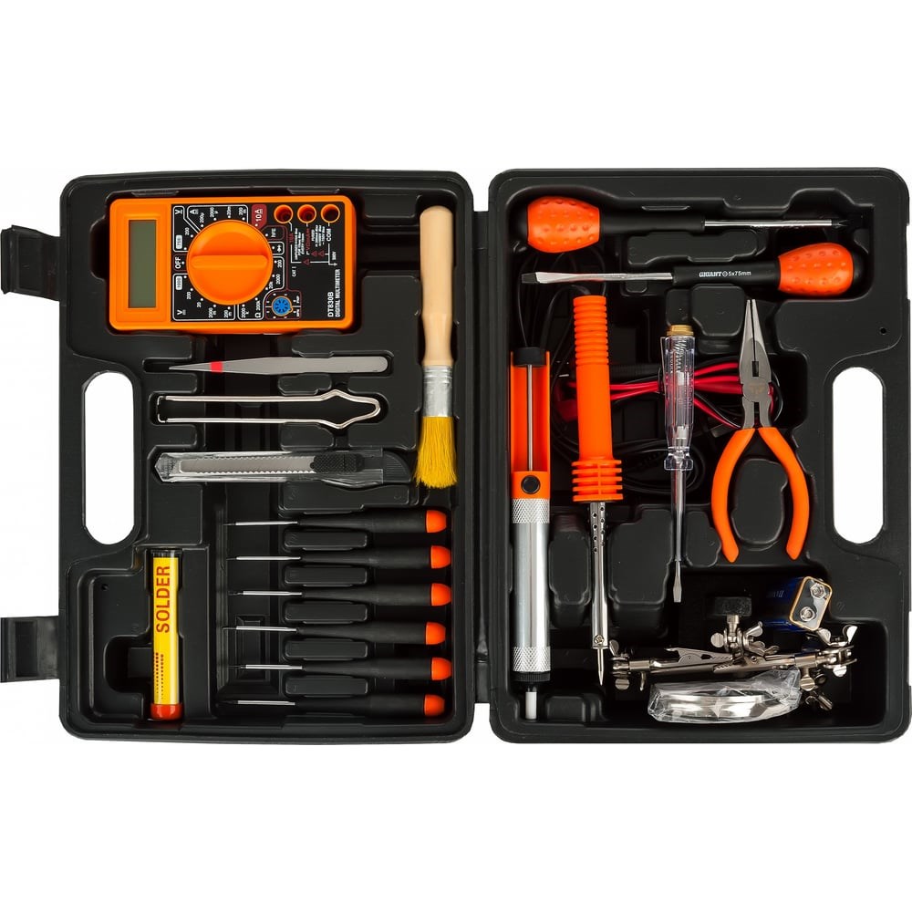 Набор инструментов 19шт Gigant GT-19 содержит все необходимое для ремонта электроники, компьютеров, бытовой техники. В комплект входят различные изделия, начиная от инструмента, заканчивая вспомогательными приспособлениями и расходными материалами. Для комфортного использования представленные инструменты оснащены удобными чехлами-рукоятками. Набор предназначается как для домашнего, так и для профессионального использования. Для сохранности комплектации в наборе предусмотрен специальный кейс с отдельными ложементами для каждого инструмента. Набор пригодится как любителю, так и мастеру. Мощность паяльника 30 Вт.