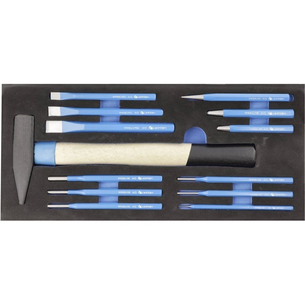 Набор ударного инструмента HOEGERT TECHNIK (10 шт.) в ложементе EVA - Мощь и Порядок в Вашей МастерскойОптимизируйте рабочее пространство и обеспечьте себя полным комплектом надежного ударного инструмента с набором HOEGERT TECHNIK.Этот комплект, включающий в себя слесарный молоток HT3B005, набор зубил, кернеров и пробойников HT3B712, является незаменимым дополнением к инструментальной тележке любого профессионала.Преимущества:Полный набор для ударных работ: Комплект включает в себя все необходимые инструменты для резки, зачистки, выбивания и маркировки твердых материалов.Надежный молоток: Слесарный молоток HT3B005 оснащен кованой и закаленной головкой с высокой твердостью (52-58 HRC) и рукояткой из прочной древесины ясеня, обеспечивающей надежный захват и эффективную передачу усилия. Металлический клин гарантирует надежную фиксацию головки на рукоятке.Высококачественные зубила, кернеры и пробойники: Изготовлены из хром-ванадиевой легированной стали, обеспечивающей высокую прочность и долговечность.Организованное хранение: Ложемент из прочной технической пены EVA обеспечивает надежную фиксацию каждого инструмента, предотвращая их повреждение и позволяя быстро находить нужный элемент.Набор ударного инструмента HOEGERT TECHNIK HT7G151 – это инвестиция в качество, надежность и порядок на вашем рабочем месте, позволяющая выполнять широкий спектр задач с максимальной эффективностью.