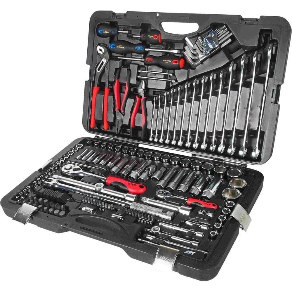 Набор инструментов JTC 145 предметов JTC-H145C поставляется в переносном кейсе, который оснащен защелками и ручкой. Набор состоит из инструментов, которые служат для проведения слесарно-монтажных работ. Рабочие части изделий изготовлены из высококачественной стали, отличаются долговечностью и надежностью применения. В комплекте 145 предметов, инструменты на квадраты 1/2 " и 1/4".