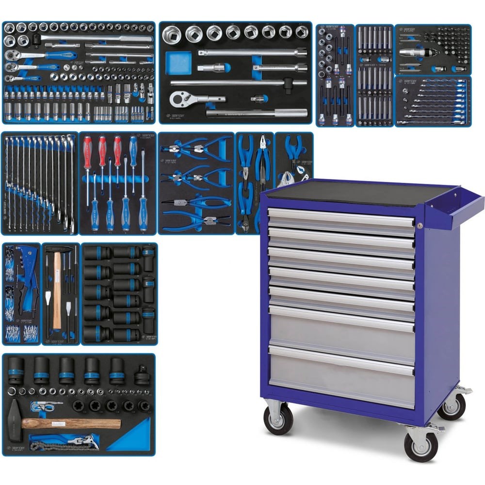 Набор инструментов KING TONY "ACTION" в синей тележке, 327 предметов 934-327AMB представлен в максимальной комплектации. 7 выдвижных ящиков разделены на 15 ложементов стандартных размеров. Благодаря этому предусмотрено размещение наборов в любом варианте. В состав набора входят ударные торцевые головки для работы с пневматическим гайковертом или трещоткой. Ложементы изготовлены из EVA - материала, устойчивого к маслам и растворителям. При деформации принимает первоначальную форму. Такие свойства обеспечивают бережное хранение инструмента.