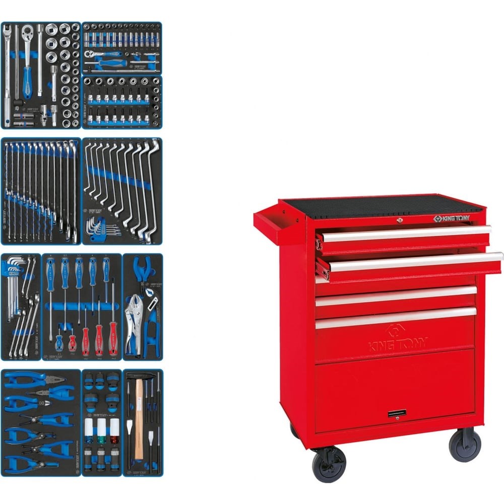 Набор инструментов KING TONY "FOCUS" в красной тележке, 188 предметов 934-188AMR представлен в расширенной комплектации. 5 выдвижных ящиков разделены на 11 ложементов стандартных размеров. Благодаря этому предусмотрено размещение наборов в любом варианте. Все комплектующие изготовлены из легированной хром-ванадиевой стали специального сплава. Этот материал износостойкий и придает инструментам особую прочность. Благодаря этому данный набор успешно используются в профессиональной сфере. В нижней части тележки предусмотрен отсек для хранения дополнительных принадлежностей.