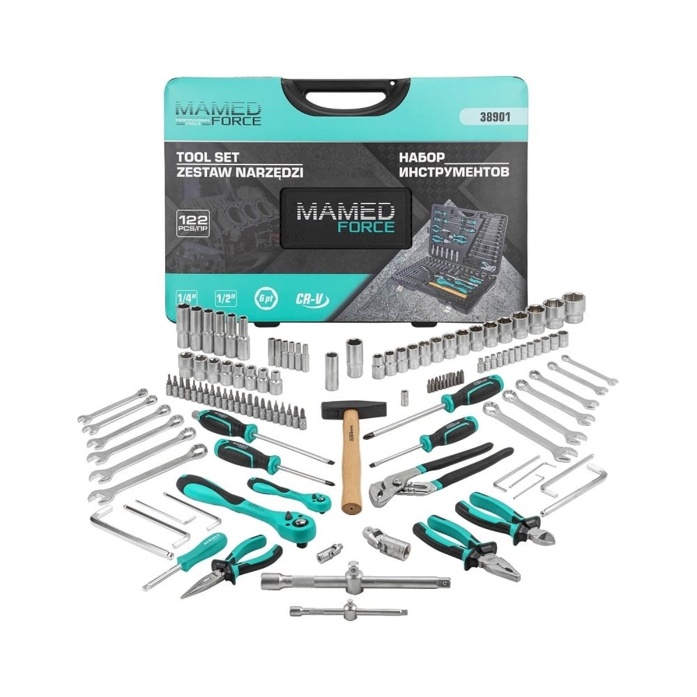 Универсальный набор инструментов MAMEDFORCE из 122 предметов, который можно с успехом использовать дома, а также в автомастерской для ремонта автомобиля. Все инструменты в комплекте выполнены из хромованадиевой стали, которая обеспечивает инструментам высокий уровень эксплуатационных свойств. В нем есть: шестигранные ключи, торцевые и свечные головки, различные удлинители и адаптеры, трещотки, держатели для бит и другие инструменты. Каждый из предметов набора имеет свое индивидуальное посадочное место в кейсе. Кейс прочный и удобный, выполнен из ударопрочного пластика. В целом, неплохой набор, который может стать отличным помощником для любого мастера, а также хорошим подарком.