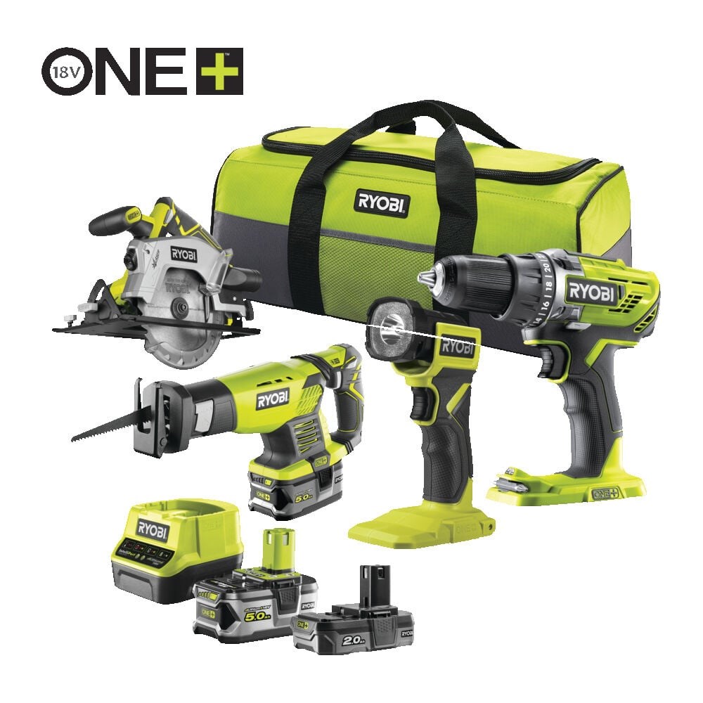 Комбо-набор RYOBI ONE+ 18V из 4 предметов Аккумуляторная дрель-шуруповерт RYOBI ONE+ R18DD3-0 идеально подходит для сверления дерева, стали и пластика, а также для закручивания крепежа. Оснащена крутящим моментом 50 Н·м и патроном на 13 мм. Сабельная пила RYOBI ONE+ RRS1801M — это идеальный инструмент для демонтажных работ, резки дерева, труб и тонкого металла. Имеет длину хода 22 мм и максимальную глубиность реза 180 мм. Циркулярная пила RYOBI ONE+ RWSL1801 обеспечивает впечатляющие возможности реза: до 45 мм под углом 90° и 32 мм под углом 45°. Идеально подходит для длинных прямых резов, раскроя листовых материалов, кухонных столешниц и напольных покрытий. Фонарь RYOBI ONE+ RLF18-0 отлично освещает пространство на коротких и средних дистанциях до 80 метров. Комплектация: 1 x Аккумулятор 2.0 А·ч (модель RB18L20) 1 x Аккумулятор 5.0 А·ч (модель RB18L50) 1 x Зарядное устройство (модель RC18120) Все поставляется в удобной сумке для инструментов.