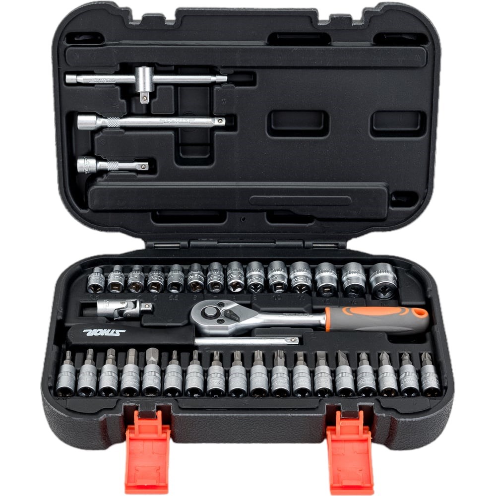 Набор инструментов STHOR 1/4 38 предметов пластиковый кейс 58640 подходит для широкой сферы применения, которая включает в себя: автомастерские; сборочные производства; мелкие и крупные предприятия. Комплектация включает в себя большое количество различной оснастки для работы со сложным крепежом, в том числе удлинители, карданы и адаптеры. Все инструменты изготовлены из хромванадиевой стали CrV 50BV3 твёрдости 45-47 HRC. В качестве дополнительного усиления использованы термообработка и холодная ковка Благодаря компактному расположению инструмента кейс обладает небольшими размерами. Это упрощает транспортировку.