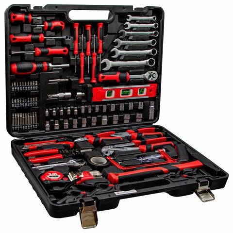 Весь инструмент располагается в ударопрочном кейсе с металлическими застежками и ручкой для удобства переноски. Каждый элемент набора надежно закреплен внутри пластикового кейса и не выпадает при переноске. Углубления для бит, торцевых головок, рожковых ключей и отверток внутри кейса пронумерованы в соответствии с размером каждого инструмента.