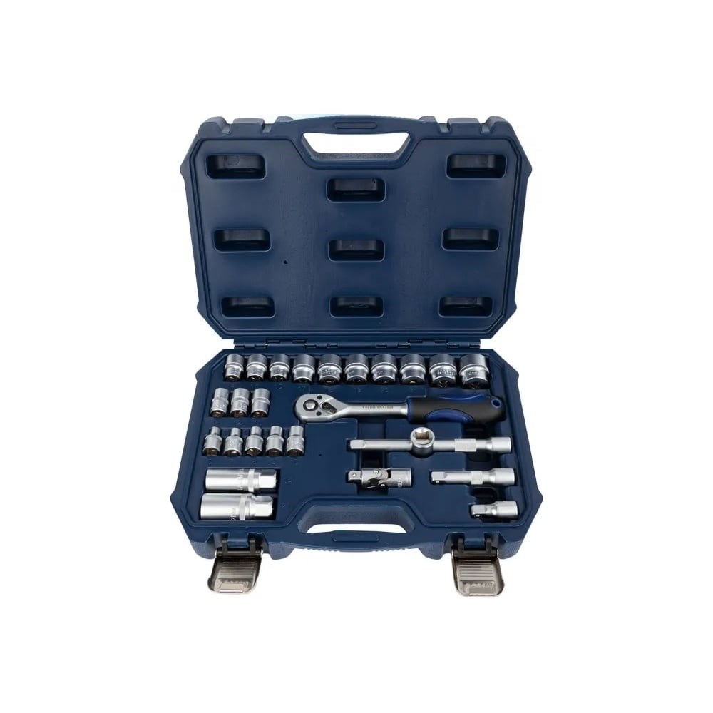 Набор инструментов предназначен для авторемонтных работ на станциях технического обслуживания и в быту. Комплект включает в себя 26 предметов с приводным квадратом 3/8 дюйма, в том числе торцевые головки, биты, трещотка, удлинители, адаптеры и шестигранные ключи. Прочный пластиковый кейс служит для удобного хранения и транспортировки.