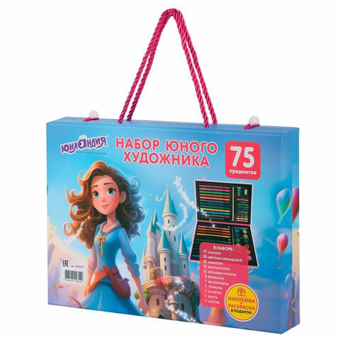Набор представляет собой кейс с красочным дизайном и грамотно подобранным наполнением из 75 предметов. Кейс раскладывается как книга. Каждый предмет надежно закреплен в ячейке. Надежный корпус кейса гарантирует полную защиту внутреннего наполнения от повреждений. Набор надежно упакован в термоусадку и короб из гофрокартона. Углы кейса дополнительно защищены от повреждений при транспортировке. Набор удобно брать с собой в школу или в поездку.