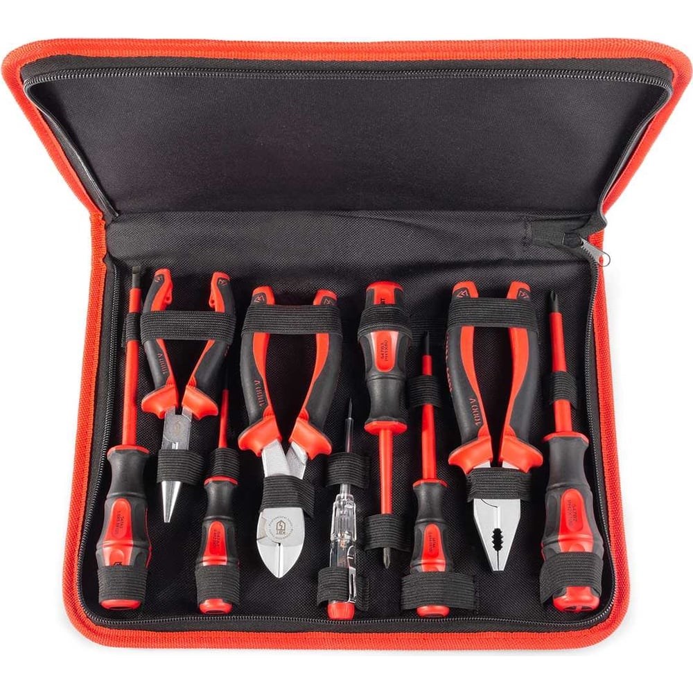 Набор изолированного инструмента КВТ НИИ-01 59380 - комплект, состоящий из пассатижей, бокорезов, длинногубцев, различных отверток и отвертки-индикатора, которые используются электриками при работах под напряжением до 1000 В. Рабочие части выполнены из высокопрочной стали. Набор поставляются в кофре для защиты от внешних воздействий и удобства переноски.