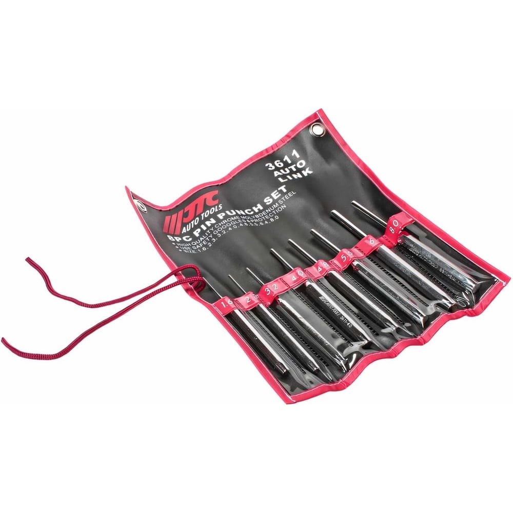 Набор выколоток 8 шт. JTC 3611 предназначен для выдалбливания отверстий в различных материалах. Рабочая часть ультратонкая. Все инструменты ударопрочные, выдерживают большие нагрузки. Имеют цилиндрический хвостовик. Набор поставляется в специальной сумке с прозрачными карманами для каждого инструмента. Габаритные размеры: 285х60х60 мм.