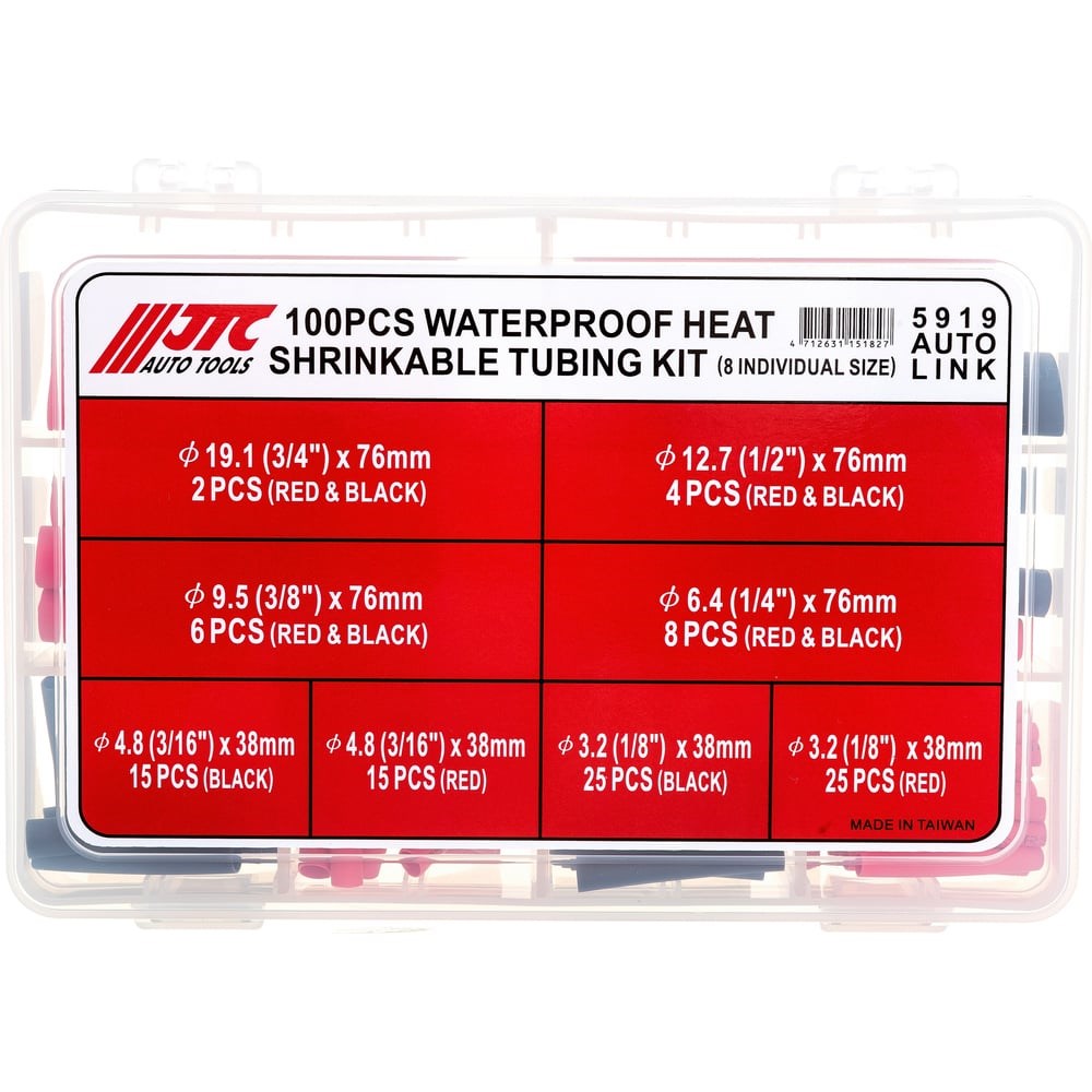 Набор термоусадочных влагозащитных трубок 6 типоразмеров, длина 38-76мм в боксе 100шт JTC-5919 включает в себя большое количество изделий для осуществления изоляции кабельных соединений и проводов, открытых разъемов, маркировки и вязки кабеля в пучки, и пр. Трубки проклеены внутри, обладают влагозащитными свойствами. Комплект подходит для применения в области промышленности, компьютерной техники, в быту, в сфере ремонта и технического обслуживания автотранспортных средств и т. д.