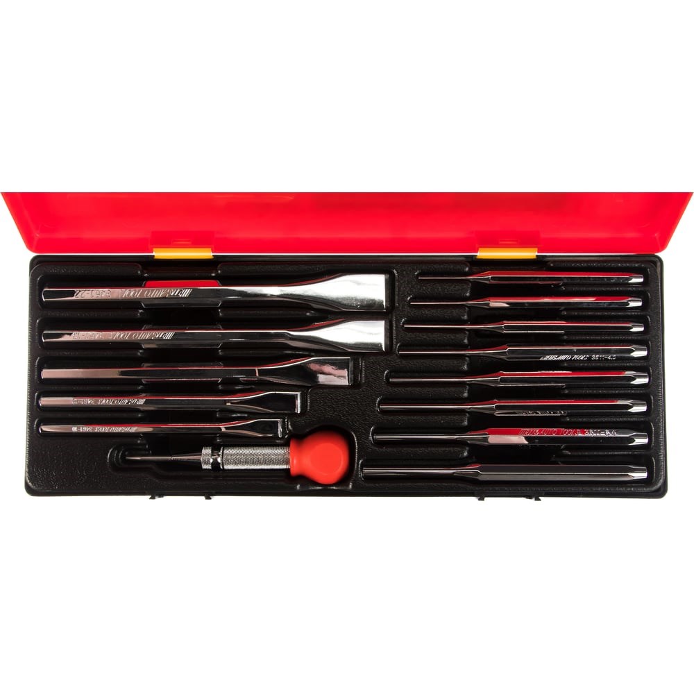 Набор выколоток и зубил с кернером в кейсе (14 предметов) JTC K8141 поставляется в боксе размером 370х145х55 мм. Автоматический кернер в хромированном корпусе оснащается закаленным наконечником. Сила удара регулируется при помощи поворотной рукояти. Вес кернера - 100 грамм. Материал оснастки - сталь.