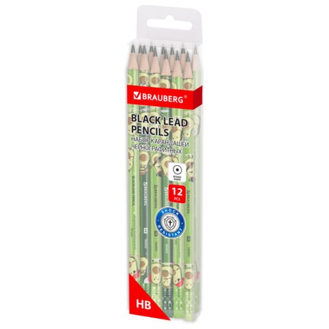 Карандаши чернографитные BRAUBERG "AVOCADO" изготовлены из пластика высокого качества. Легко и ровно затачиваются, максимально устойчивы к повреждениям. Ударопрочный грифель диаметром 2.0 мм не царапает бумагу и не крошится. Карандаши длиной 190 мм обладают универсальной степенью твердости – HB. Имеют круглый корпус с яркой печатью, оснащены цветными ластиками. Корпус выполнен в четырёх дизайнах ассорти c изображением забавного персонажа- авокадо. Набор карандашей чернографитных BRAUBERG "AVOCADO" упакован в упаковку из ПВХ с подвесом по 12 штук.