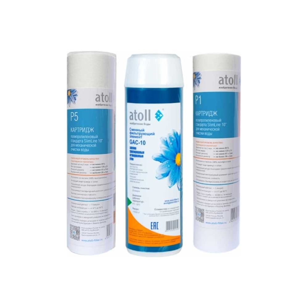 Набор картриджей atoll №202 STDA — это комплект оригинальных расходных материалов для систем обратного осмоса. Срок службы зависит от условий использования и качества входящей воды, рекомендуемая периодичность замены — каждые 6 месяцев. Комплект содержит три картриджа: механической очистки воды — atoll P5 из полипропилена. Задерживает примеси >5 мкм очистки от органических примесей — atoll GAC-10. Гранулированный активированный уголь удаляет из воды хлор, неприятные запахи, улучшает органолептические качества воды. Имеет встроенный постфильтр, дополнительно удаляющий примеси >20 мкм тонкой механической очистки — atoll P1 из полипропилена. Служит для удаления грязи и нерастворимых частиц >1 мкм Картриджи P1 и P5 изготовлены из плотноволокнистого полипропилена, не привносят в воду посторонние запахи и вкусы, имеют увеличенный срок службы. Рабочий диапазон температуры воды — от 4 до 62 градусов по Цельсию. Жесткость конструкции позволяет не применять в сменном элементе сердечник. Комплект картриджей atoll №202 STDA применяют в системах модельного ряда Атолл: A-550, A-560, A-575.
