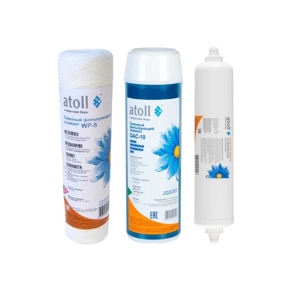 Набор (префильтры + постфильтр) Atoll №207 STDA предназначен для замены использованных элементов в системах обратного осмоса. Подходит для модели: Atoll A-4400p STDA. Рекомендуемый срок замены: 6 месяцев. Набор картриджей Atoll №207 STDA содержит: Полипропиленовый картридж Atoll WP-5 (намотка, полипропилен) для очистки воды от механических примесей. Обладает высокой устойчивостью к воздействию бактерий и химикатов. Задерживает частицы размером более 5 мкм Угольный картридж atoll GAC-10 (гранул.уголь) для очистки воды от хлора и летучих органических соединений In-line модуль Atoll CK-5633C-1/4'' (порошковый активированный уголь). Поглощает остаточные запахи и загрязнения Набор предназначен для использования входящих в его комплект картриджей для периодической замены использованных элементов в системах обратного осмоса торговой марки atoll. Все сменные фильтрующие элементы, входящие в этот набор, имеют стандартные типоразмеры, и могут быть использованы для большинства фильтров других производителей. Внимание! Применение в фильтрах atoll картриджей сторонних производителей не обеспечивает характеристик, заявленных в паспорте на фильтр. Использование несертифицированных картриджей или картриджей неустановленных производителей может нанести вред Вашему здоровью. Срок службы каждого картриджа, входящего в состав этого набора, зависит от его ресурса, установленного производителем. Как правило, при очистке воды в условиях городского водоснабжения, и потребления очищенной воды семьей из 4 человек, картриджи имеют существенный запас (до 50%) по ресурсу. Однако настоятельно рекомендуется не превышать рекомендованные сроки замены картриджей, указанные в паспортах на устройства очистки воды. Особенно это касается тех случаев, когда фильтр не использовался в режиме очистки в течение длительного срока.