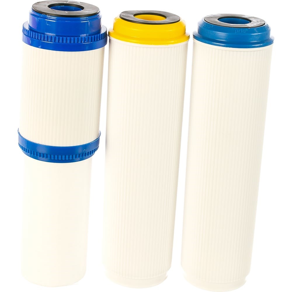 Набор картриджей Prio Новая вода К 602 предназначен для фильтров Prio Новая вода Praktic EU305, EU320 и состоит из трех картриджей: К 604 применяется для механической очистки воды от примесей и ржавчины, а также обеспечивает очистку воды от хлора, хлорорганических соединений, пестицидов, нефтепродуктов, тяжелых металлов, устраняет неприятный запах воды и улучшает ее вкус. Часть картриджа выполнена из нетканого полипропилена с тонкостью фильтрации 5 микрон, другая часть состоит из гранулированного кокосового активированного угля. К 300 умягчает воду, уменьшает количество накипи на нагревательных элементах бытовых приборов, снижает содержание в воде ионов некоторых металлов. Картридж содержит пищевую ионообменную Na-катионитовую смолу. К 205 предназначен для очистки воды от хлора, хлорорганических соединений, пестицидов, нефтепродуктов, тяжелых металлов и прочих органических и неорганических соединений. Картридж изготовлен из гранулированного кокосового активированного угля.