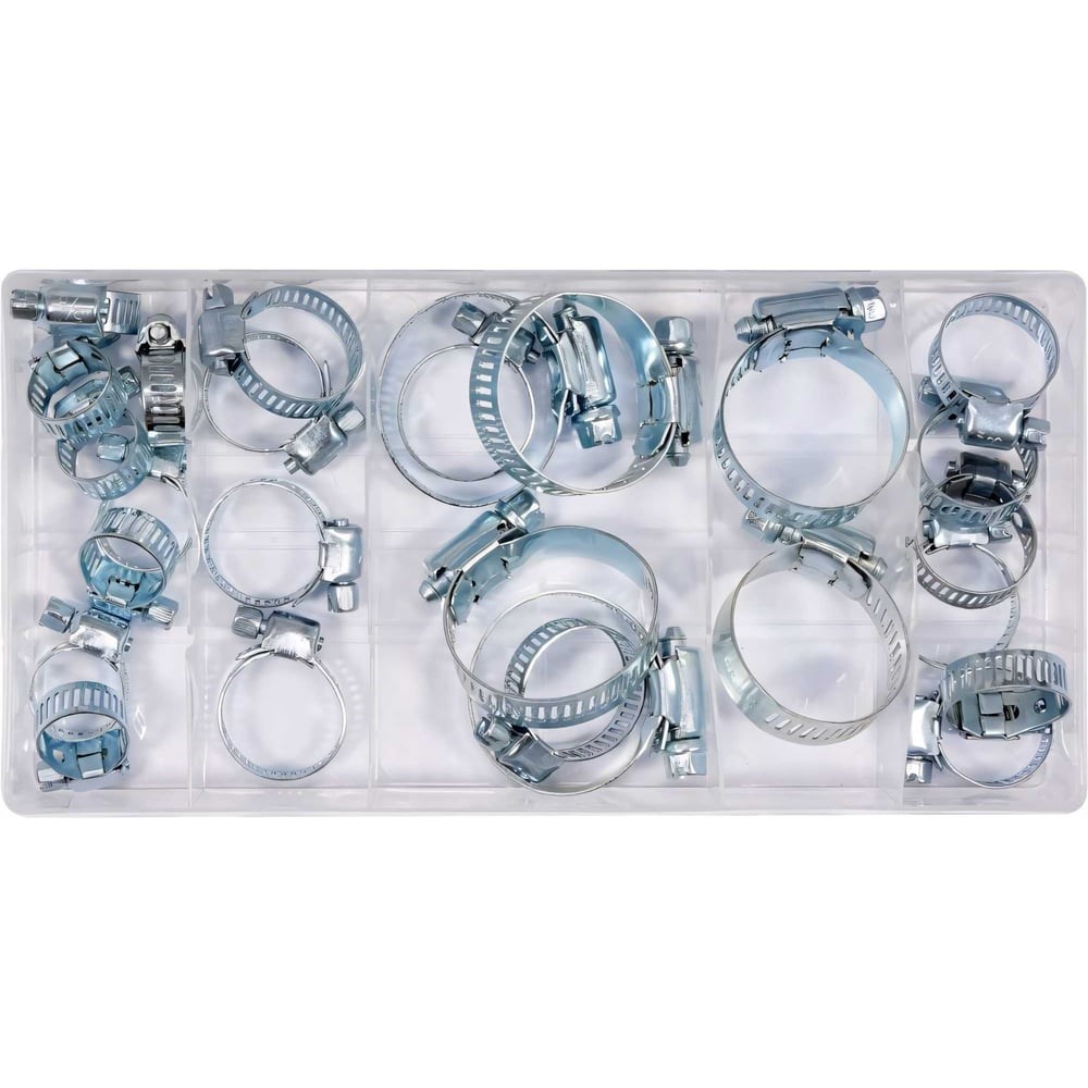 Набор зажимов размерами от 16 мм до 40 мм. YT-06782 Диаметр 16, 22, 25, 28, 35, 40 мм Материал изготовления: железо Обработка поверхности Гальванизация Количество штук в наборе 26