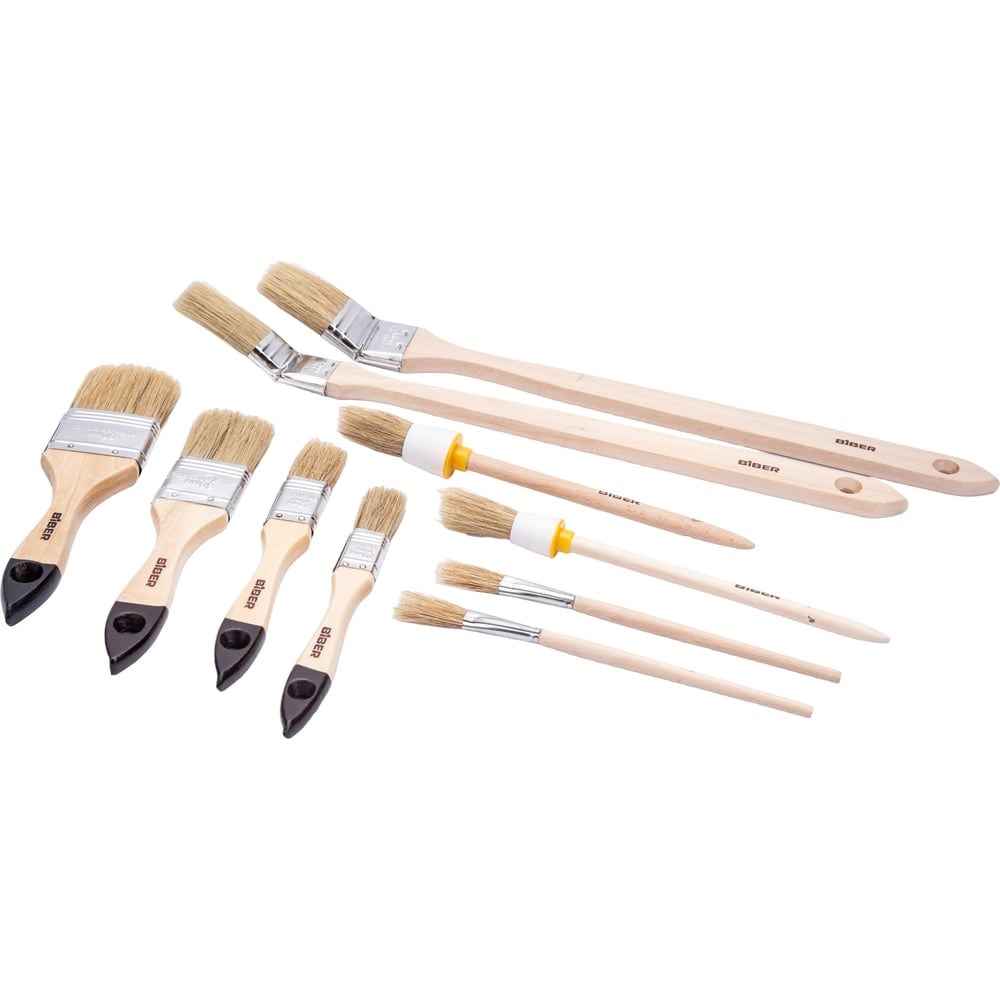 Набор кистей, натуральная щетина Biber 31404 тов-115037 включает в себя малярные инструменты различных форм и размеров. Такой комплект отлично разнообразит арсенал мастера лакокрасочных работ. Представленные кисти совместимы с масляными, алкидными и акриловыми лакокрасочными материалами. Изделия выполнены из натурального ворса в сочетании с деревянными рукоятками.