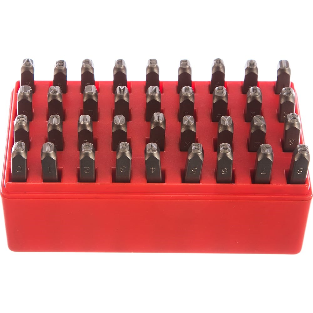 Набор клейм Hans букв и цифр 36 предметов, 4 мм 561501-364 изготовлен из хром-ванадиевого сплава, закаленного токами высокой частоты (индукционная закалка, твердость порядка 52-55 HRC).