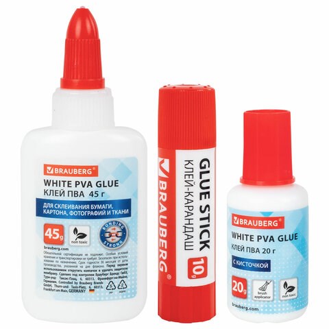 Набор клея BRAUBERG (клей-карандаш PVP 10 г, клей ПВА 45 г, клей ПВА 20 г с кисточкой), блистер, 271978