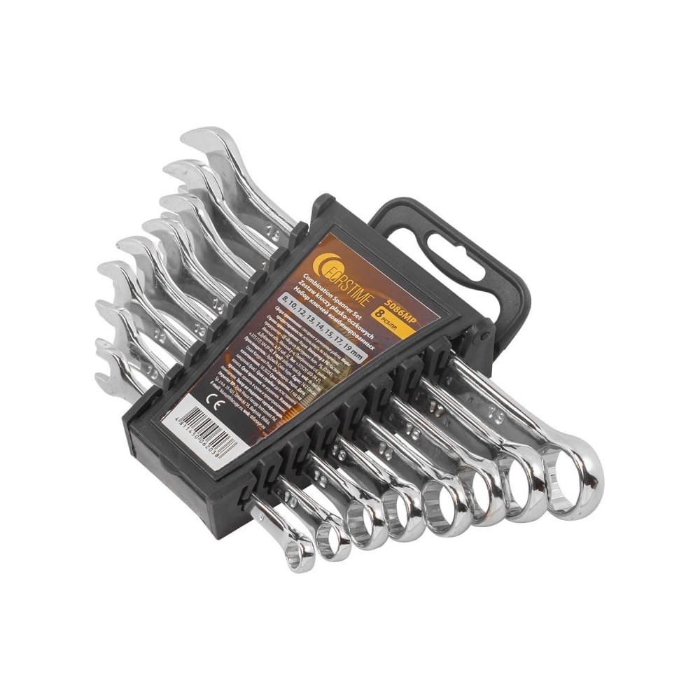 Набор ключей комбинированных 8 предметов от бренда FORSTIME. Надежные ключи помогут открутить/закрутить резьбовые соединения в любых условиях. Размеры проштампованы с обеих сторон каждого ключа, для облегчения идентификации. Изготовлены из хромованадиевой стали (CR-V). Хромированную поверхность - легко чистить от масла и грязи. Антикоррозионное покрытие. Для удобства хранения и транспортировки, поставляется в пластиковом держателе. Положение каждого ключа в собственной ячейке. Занимают мало места. Профиль накидной части: 12 граней. Угол отклонения накидной части: 15. Сфера применения: предприятия промышленности, строительная сфера, для дома и дачи и др. Размеры ключей: 8,10,12,13,14,15,17,19мм.