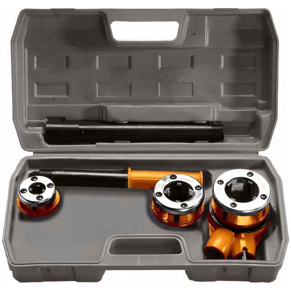 Набор клуппов SPARTA 1/2"-3/4"-1"+ плашкодержатель с трещоткой, 6 предм 773335 поставляется в удобном кейсе, для переноски и хранения инструментов. Набор состоит из трех клуппов размерами 1/2, 3/4 и 1 дюйм. Данные предметы предназначены для нарезания дюймовой конической резьбы на трубах различных диаметров. Данные инструменты изготовлены из углеродистой стали, что определяет их прочность и долговечность.