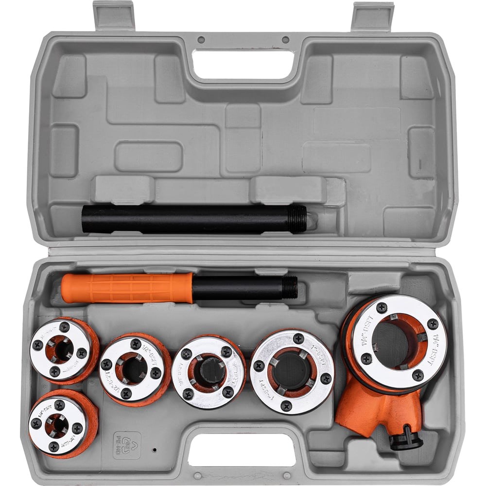 Набор клуппов 9 предметов SPARTA 773355 состоит из трубных клуппов, плашкодержателя с трещоткой и сборной рукоятки. Применяется для быстрого нарезания дюймовой конической резьбы на трубах в любом, даже труднодоступном месте. Все предметы изготовлены из прочных материалов и уложены в пластмассовый кейс, что способствует удобству хранения и транспортировки.
