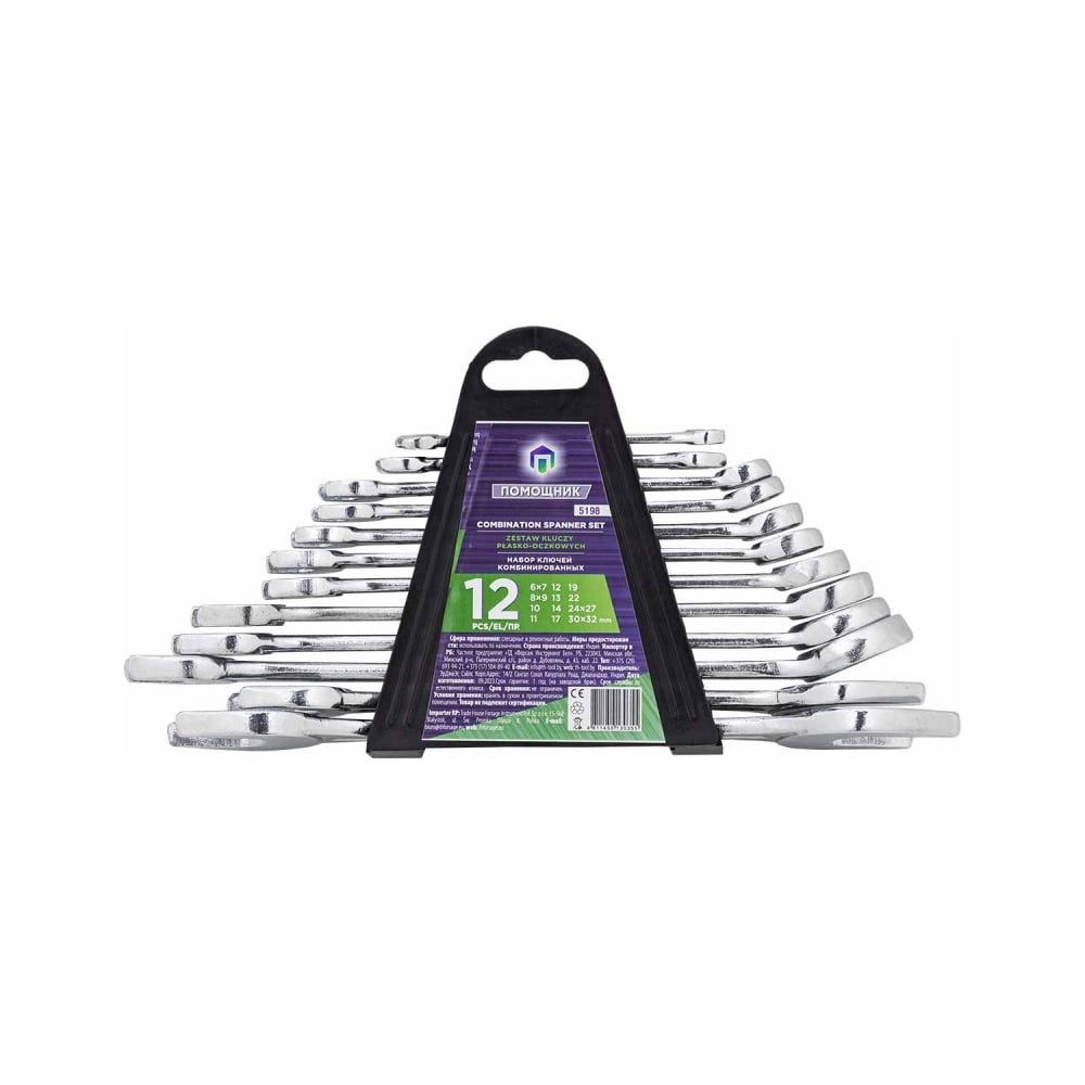 Набор ключей комбинированных 12 предметов от бренда Помощник применяется для работы с крепежом различных размеров при ремонте автомобиля или в бытовых условиях.Каждый инструмент представляет собой сочетание из рожкового и накидного ключа, расположенных на одной общей рукоятке. Рожковая сторона ключа подходит для работ с крепежом, доступ к которому есть лишь с одной стороны, а накидная часть для проведения работ с высоко нагруженными резьбовыми соединениями.Качество. Ключи изготовлены из высококачественной хромованадиевой стали, что значительно увеличивает их устойчивость к механическим нагрузкам, а также надежную защиту от коррозии.Основным преимуществом данного набора является компактность размеров упаковки и состав набора, в который включены только самые необходимые и востребованные размеры.Многопрофильность. Подходит для ремонта легковых и грузовых автомобилей мототехники, квадроциклов, снегоходов, гидроциклов, спецтехники, садовой техники и прочих слесарно-монтажных работ с болтовым и гаечным крепежом.