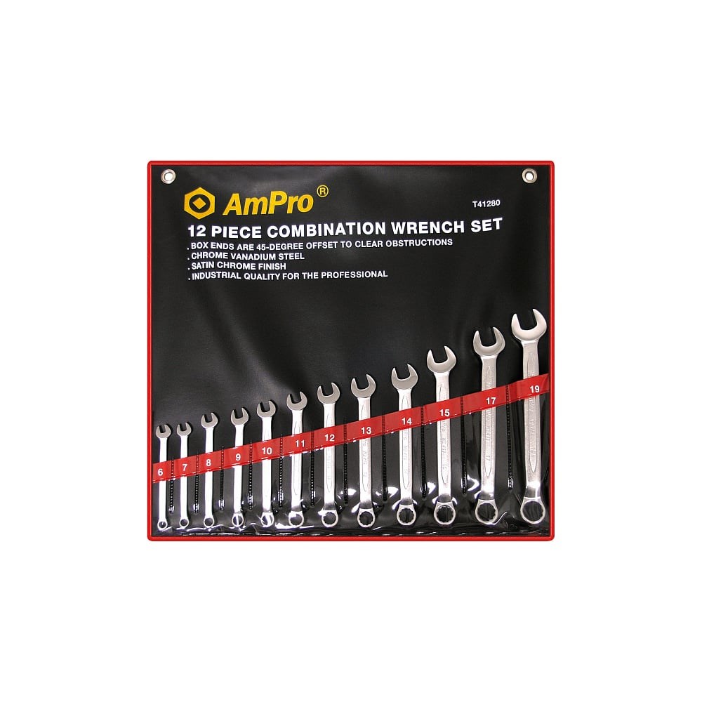 Набор ключей AmPro комбинированных c изогнутой головкой, 12 предметов 6-19мм, T41280 подходит для крепежа различного вида. Инструмент имеет высокую прочность, которая обеспечивает работу с большим усилием. Комплект легко справляется с классическими креплениями без вспомогательного оборудования. Это значительно упрощает работу монтажника на производстве или мастера в сервисе.
