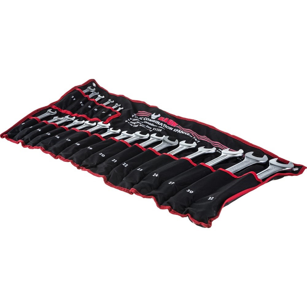 Набор комбинированных ключей BAUM 75 градусов, 22 предмета 40-22M - имеет сразу 2 варианта рабочих поверхностей и предназначен для проведения работ с крепежными изделиями, имеющими стандартный внешний 2-12-гранный профиль. Данный набор состоит из 22 комбинированных ключей, имеющих с одной стороны 2-гранный захватный рожок, а с другой накидную петлю с 12-гранным профилем, это делает такие ключи более универсальными. Захватные накидные петли всех ключей отогнуты ступенькой на 75°от плоскости ключа, а ось симметрии рожкового захвата находится под углом в 15° к оси ключа. Характеристики: Металл - СrV инструментальная сталь. Технология и геометрия соответствуют международному стандарту DIN 3113B. Упаковка- тканевая скрутка.