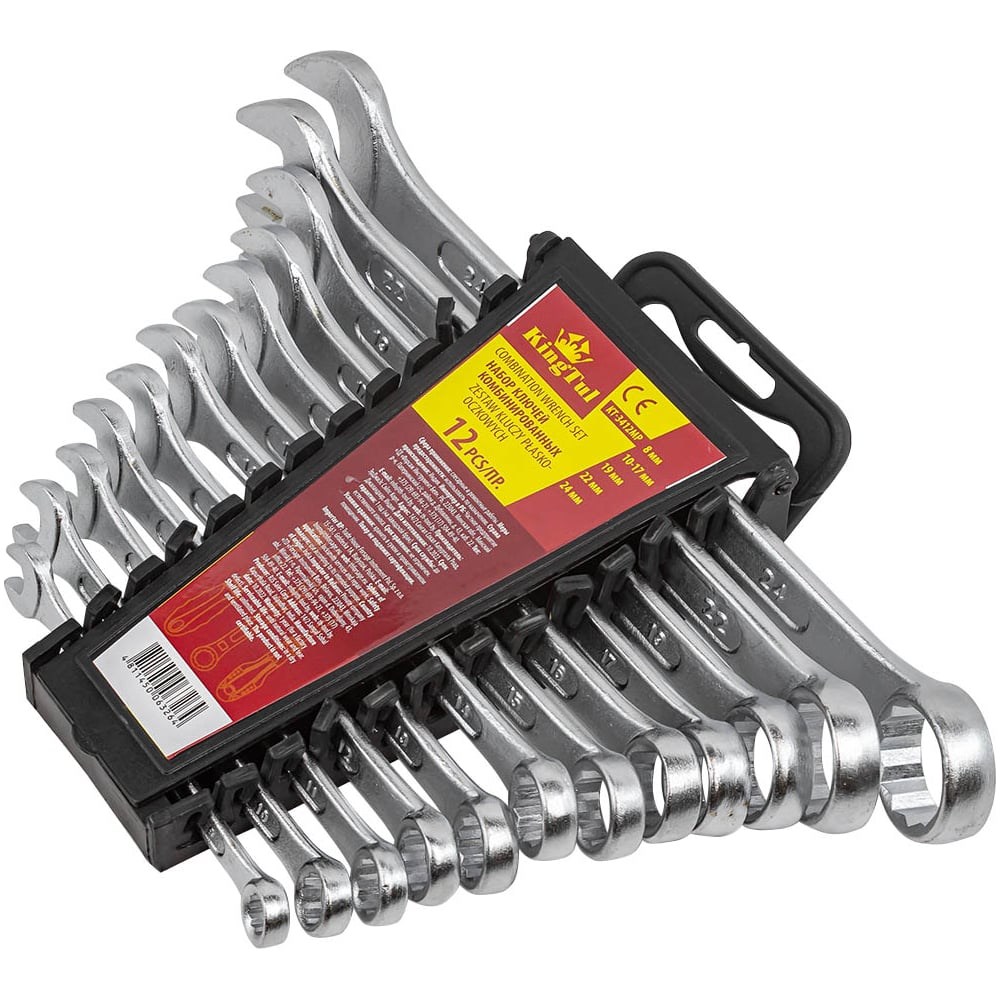 Набор ключей комбинированных 12 предметов от бренда KINGTUL применяется для работы с крепежом различных размеров при ремонте автомобиля или в бытовых условиях. Каждый инструмент представляет собой сочетание из рожкового и накидного ключа, расположенных на одной общей рукоятке. Рожковая сторона ключа подходит для работ с крепежом, доступ к которому есть лишь с одной стороны; а накидная часть для проведения работ с высоко нагруженными резьбовыми соединениями. Ключи изготовлены из высококачественной хромованадиевой стали, что значительно увеличивает их устойчивость к механическим нагрузкам, а также надежную защиту от коррозии. Основным преимуществом данного набора является компактность размеров упаковки и сбалансированный состав набора, в который включены только самые необходимые и востребованные размеры. Благодаря тому что инструмент собран в набор, исключается потеря отдельных комплектующих, как часто бывает при хранении инструмента россыпью. Набор поставляется в удобном пластиковом держателе, из которого легко извлекать нужный инструмент. Размеры: 8, 10, 11, 12, 13, 14, 15, 16, 17, 19, 22, 24 мм. Такой набор пригодится как автолюбителям, так и мастерам. Его основное достоинство проводить работы в самых труднодоступных местах. Превосходно подходит для ремонта легковых и грузовых автомобилей мототехники, квадроциклов, снегоходов, гидроциклов , спецтехники, садовой техники и прочих слесарно-монтажных работ с болтовым и гаечным крепежом.