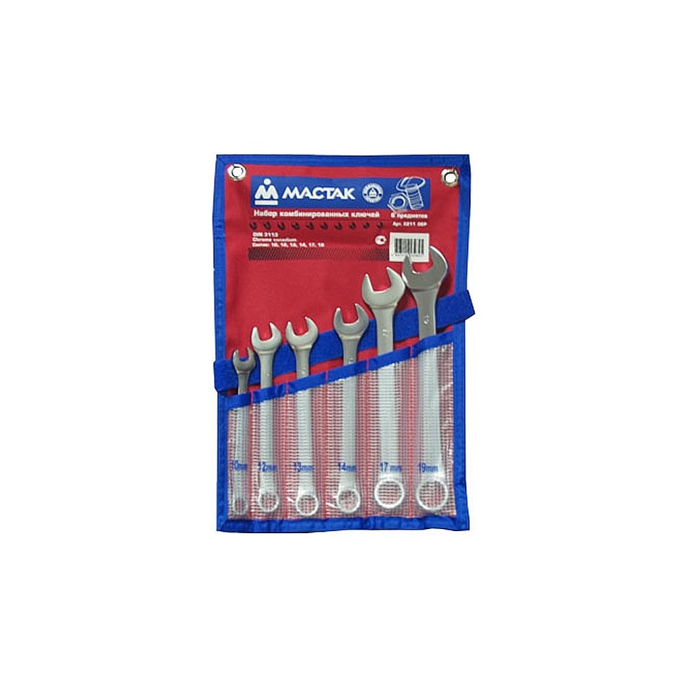 Набор комбинированных ключей 10-19мм 6шт МАСТАК 0211-06P состоит из шести ручных инструментов для работы с болтовыми соединениями. Каждый компонент изготовлен из прочной и качественной стали, оснащен двумя типами головок - кольцевой и рожковой, для возможности работы в труднодоступных местах.