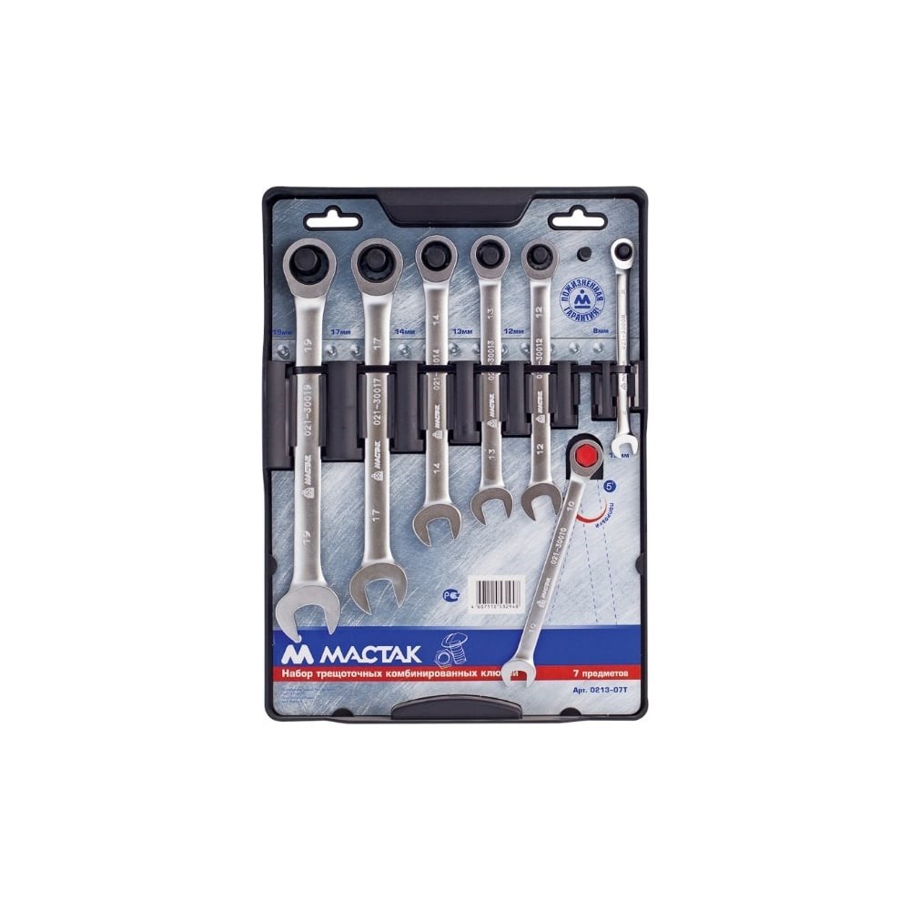 Набор комбинированных трещоточных ключей (8-19 мм, 7 предметов) МАСТАК 0213-07T обеспечивает простой и быстрый демонтаж крепежа. Рожковая часть изогнута на 15 градусов для удобства доступа к оснастке. 12-гранный профиль трещотки дает возможность работать с 6-гранными и 12-гранными элементами.