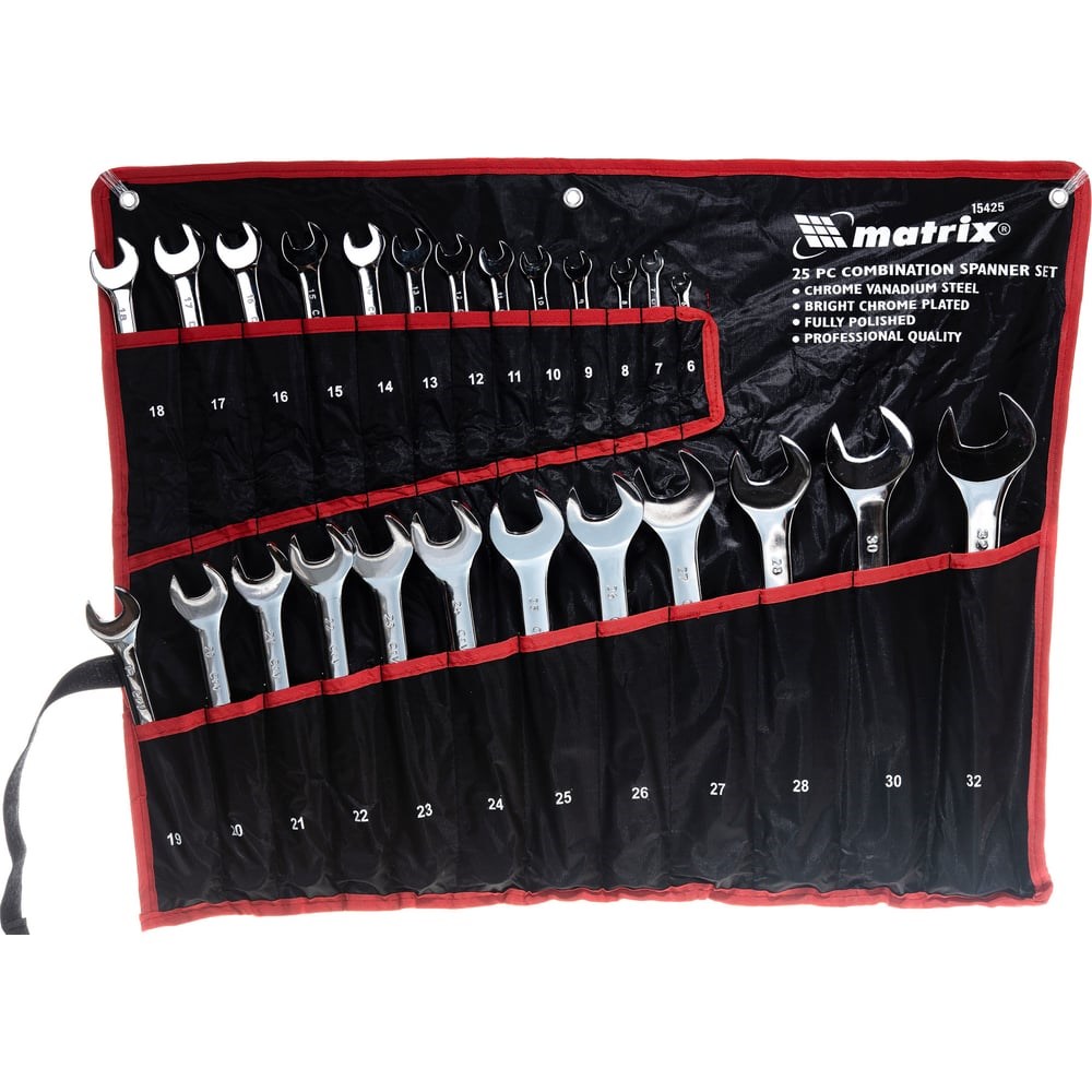 Набор комбинированных ключей, 6 - 32 мм, 25 шт., MATRIX 15425 предназначен для ремонтных работ, когда необходимо осуществить монтаж или демонтаж резьбовых соединений. Изготовлен из хромованадиевой стали и имеет хромоникелевое покрытие, что обеспечивает высокую прочность и долговечность. Твердость материала соответствует ГОСТу (48 HRс). Профиль каждого ключа имеет двенадцать граней, что обеспечивает больший захват рабочей поверхности. Головка ключа находится под углом 15° к основной оси, что делает работу более эффективной. Для удобства хранения и транспортировки предусмотрен чехол, в котором каждый ключ находится в отдельном кармане.