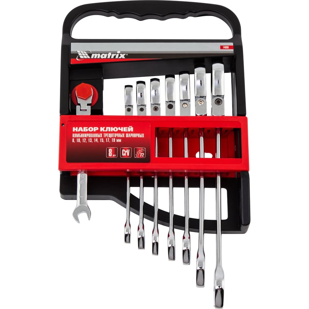 Набор из 8 комбинированных трещоточных шарнирных ключей Matrix 14898 пригодится мастерам и автолюбителям для фиксации и раскручивания крепежных элементов. Трещоточный механизм повышает скорость работы и легко справляется даже с закисшим крепежом.