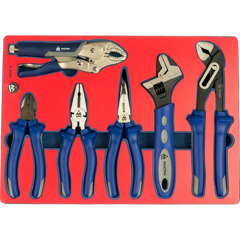 Набор пассатижей, плоскогубцев и бокорезов 6шт МАСТАК 5-3006 сочетает в себе наиболее оптимальное сочетание ручных шарнирно-губцевых инструментов для выполнения слесарно-монтажных работ. Каждый инструмент располагается в отдельной ячейке в ложементе из материала EVA. Набор идеально подходит для укомплектовывания рабочих мест в мастерских, на производстве и на станциях ТО для ремонта различной техники.