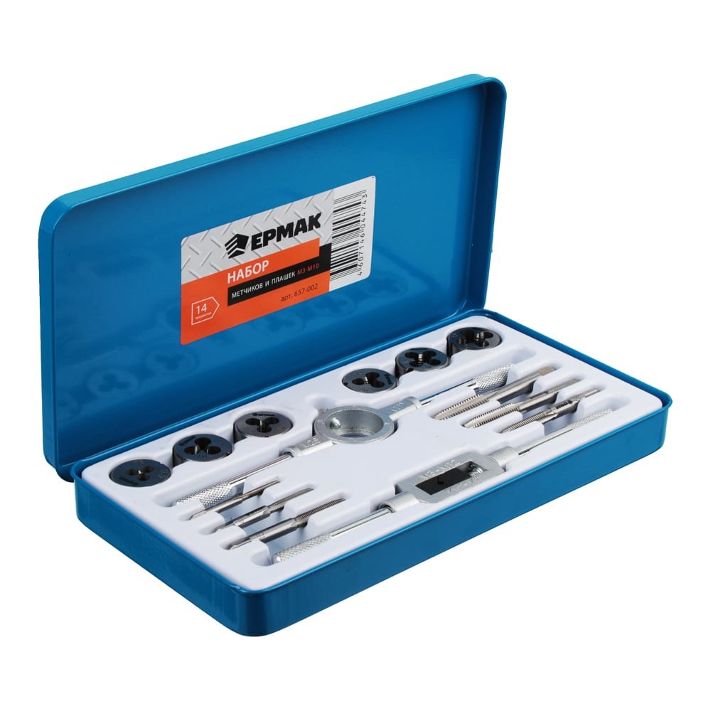 Набор метчиков и плашек ЕРМАК 14 предметов М3-М10 657-002 используется для выполнения резьбонарезных работ. Элементы набора упакованы в футляр, что способствует удобству хранения и транспортировки. Ложемент с ячейками препятствует перемешиванию и повреждению инструмента при перевозке.