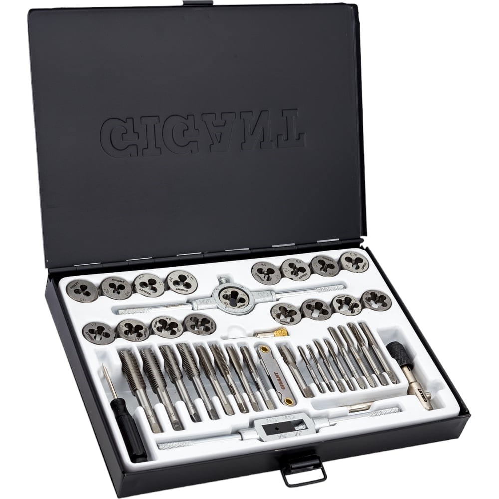 Набор метчиков и плашек 40 предметов Gigant STD040 содержит инструменты и приспособления для нарезания и калибрования внешней и внутренней резьбы на металлических деталях и заготовках. Входящие в комплект предметы выполнены из прочной и долговечной стали 9XC. Повышенная износостойкость, упругость; Сопротивление изгибу и кручению; Стойкость к высоким нагрузкам; Удобный кейс обеспечивает сохранность и мобильность набора.