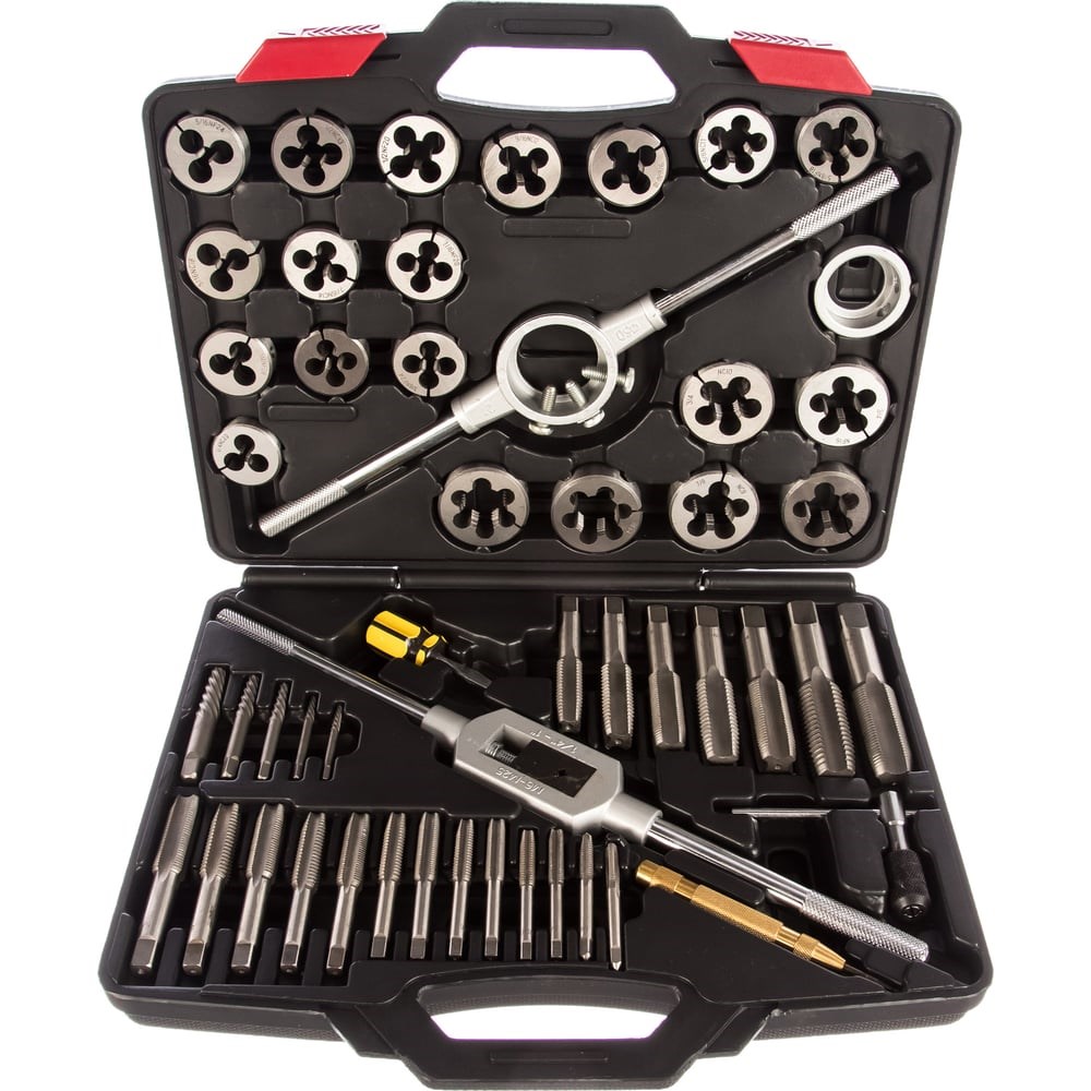 Набор метчиков и плашек МАСТАК SK-5 1/4-1, кейс, 51 предмет 351-10051C представляет собой комплект приспособлений, с помощью которого можно наносить внутреннюю или внешнюю резьбу. Изделия изготовлены из быстрорежущей инструментальной стали SK5. Комплект поставляется в кейсе из пластика.